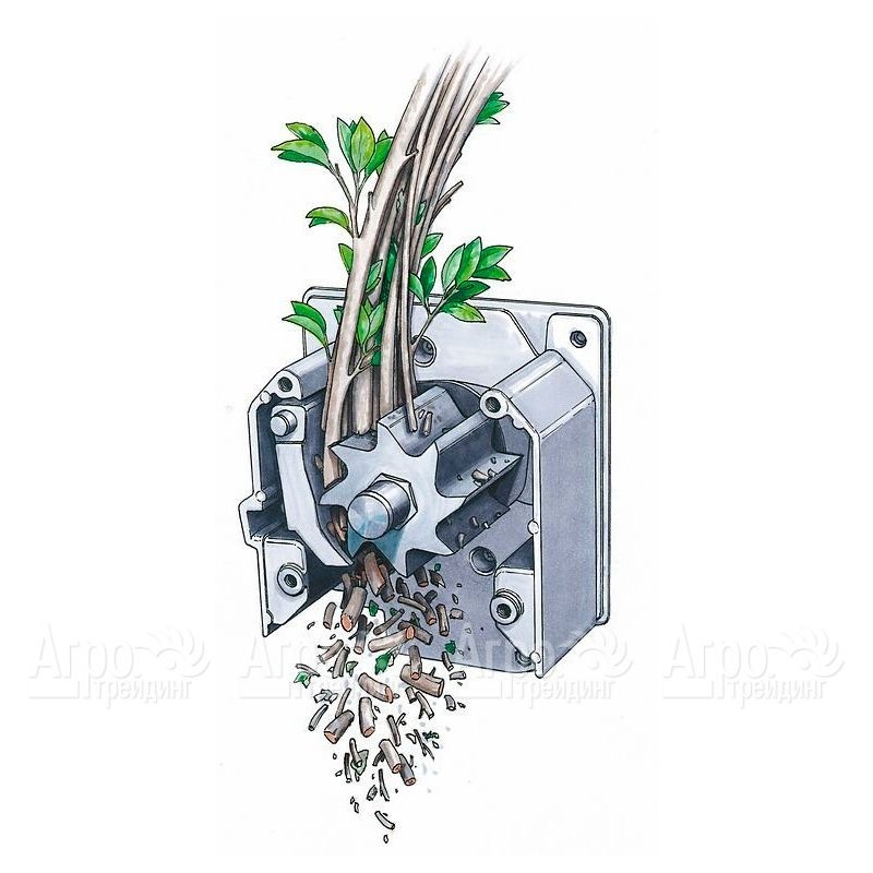 Агрегат устойчив на поверхности и удобен при перемещении. Вращающиеся шестерни обеспечивают втягивание веток через вальцовый механизм, представляющий ножевой валик, который, при вращении перемалывает ветки. Загрузочная воронка удобна для закладки материала. При заклинивании происходит автоматический реверс. Корпус изготовлен из качественного и прочного полимера. В электродвигателе предусмотрена термозащита.